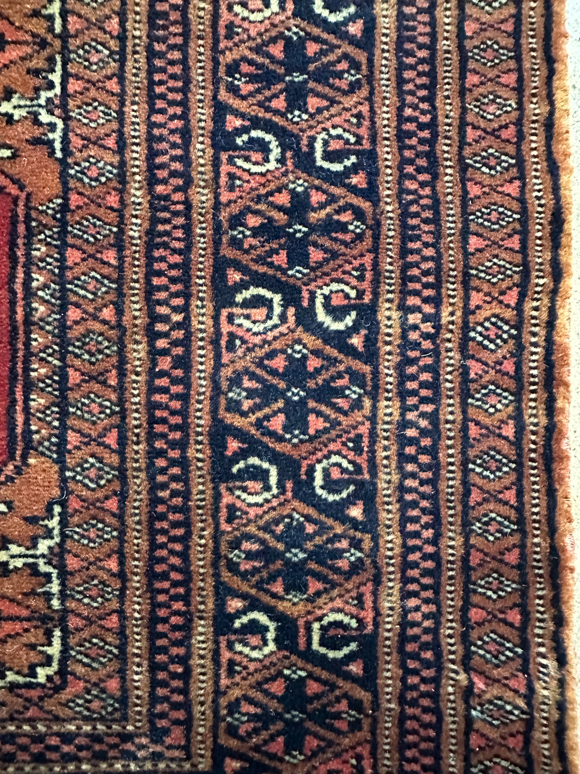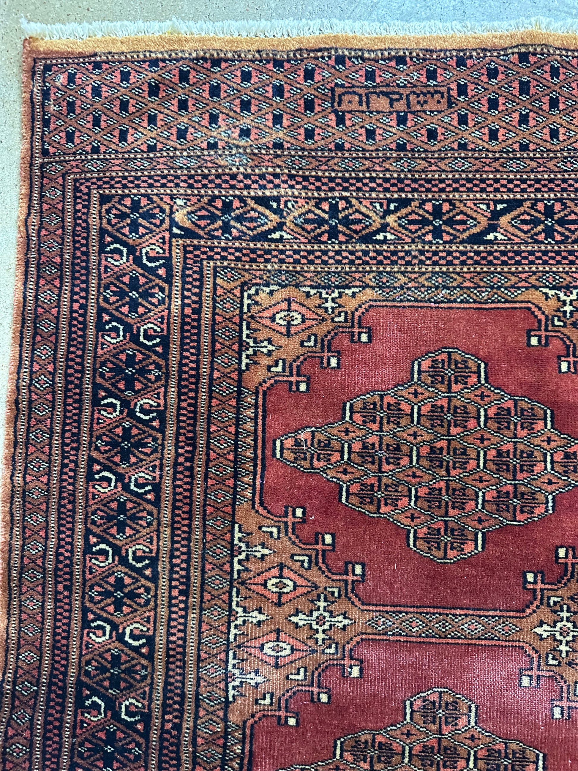 100% wool handmade with natural coloring, thin fiber medium pile with a short pile silky feel. Slight patina on part of the rug