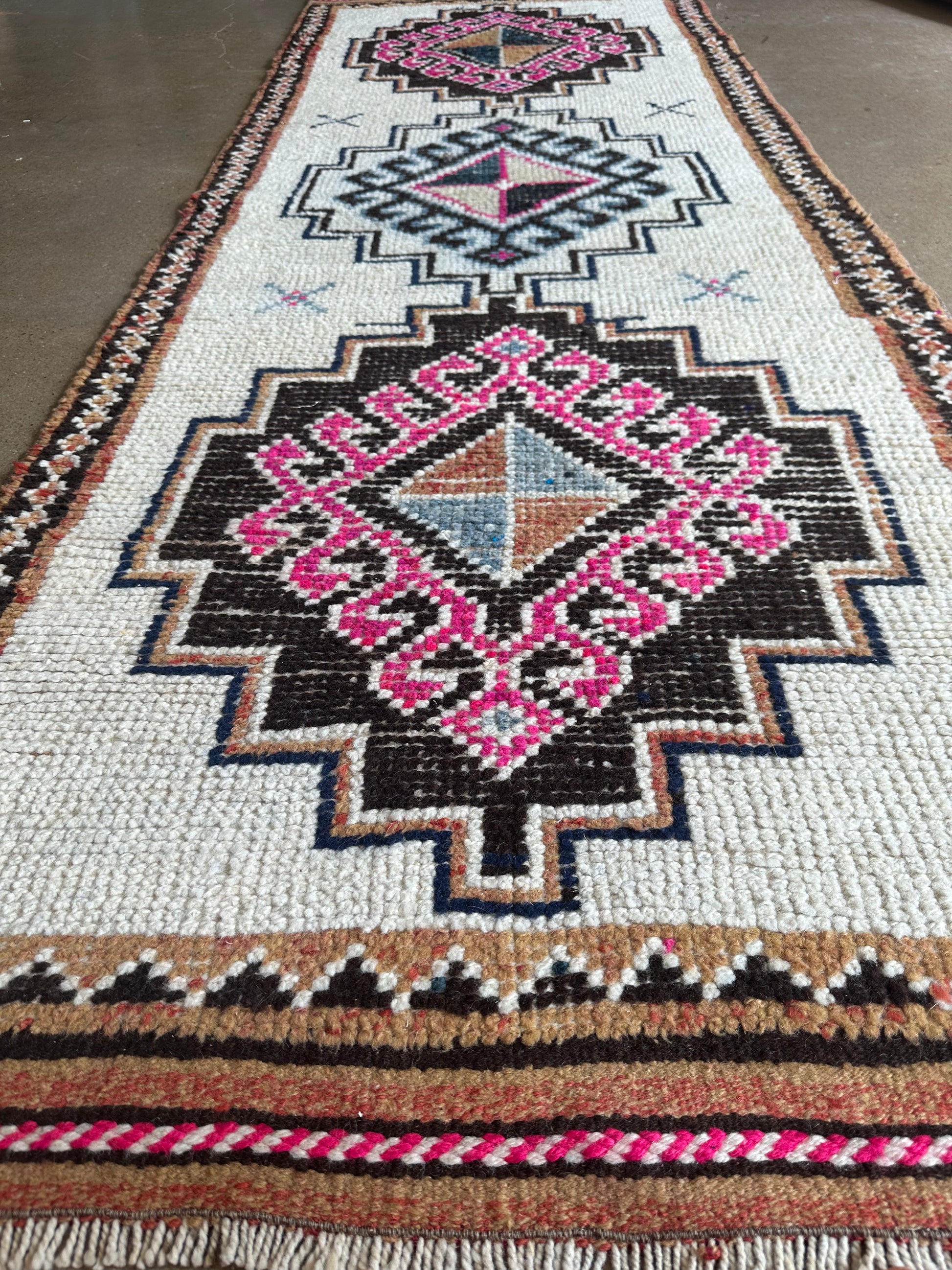 Soft Medium-High Pile, was once a longer runner and has since had a portion of the middle removed to shorten. If you look close enough you can tell where the repair is in the design, but this is not an obvious change to the rug. It was an excellent rug modification that does not impact the integrity of the rug. Love the hot pink and blues orange centers.