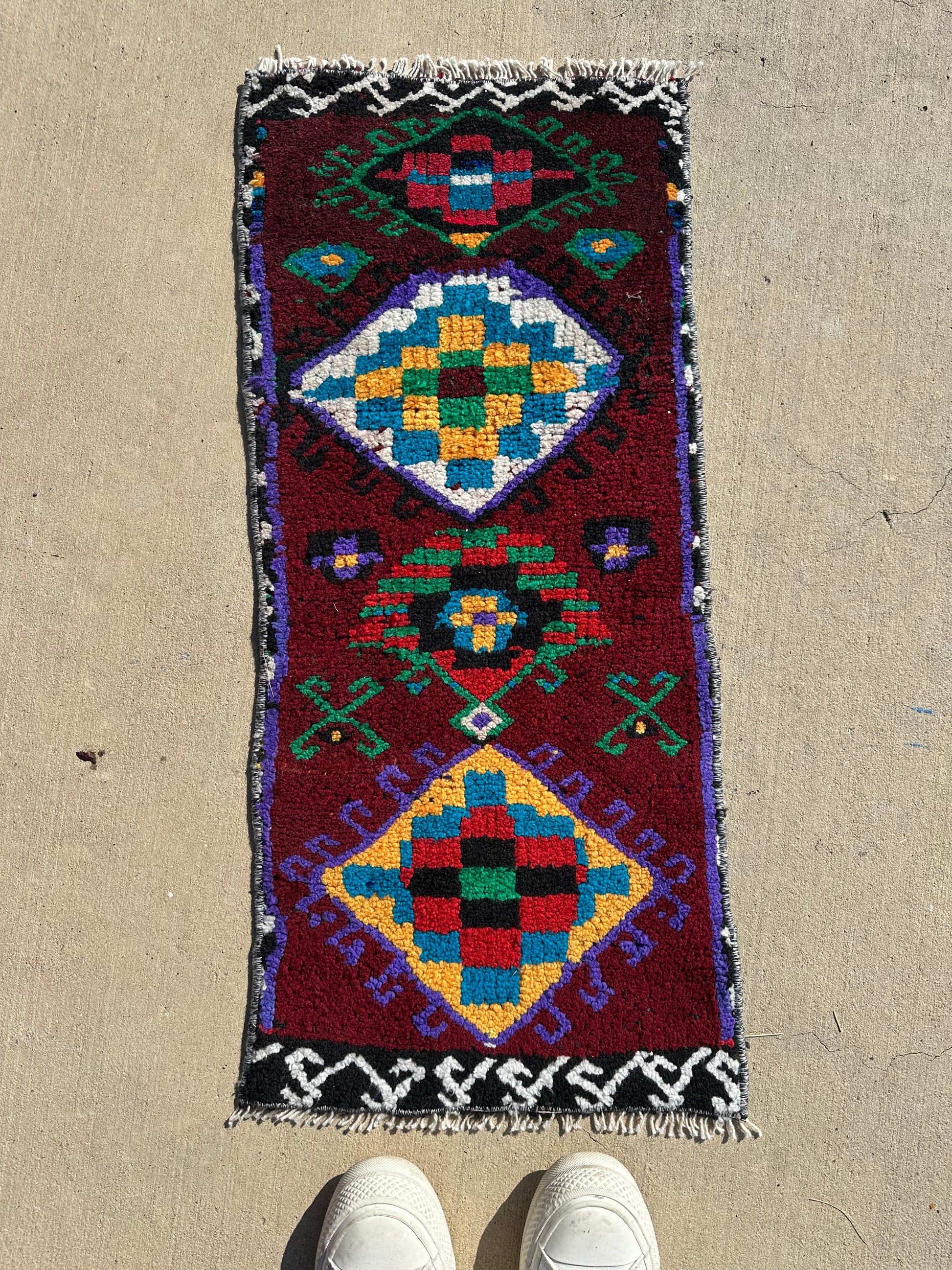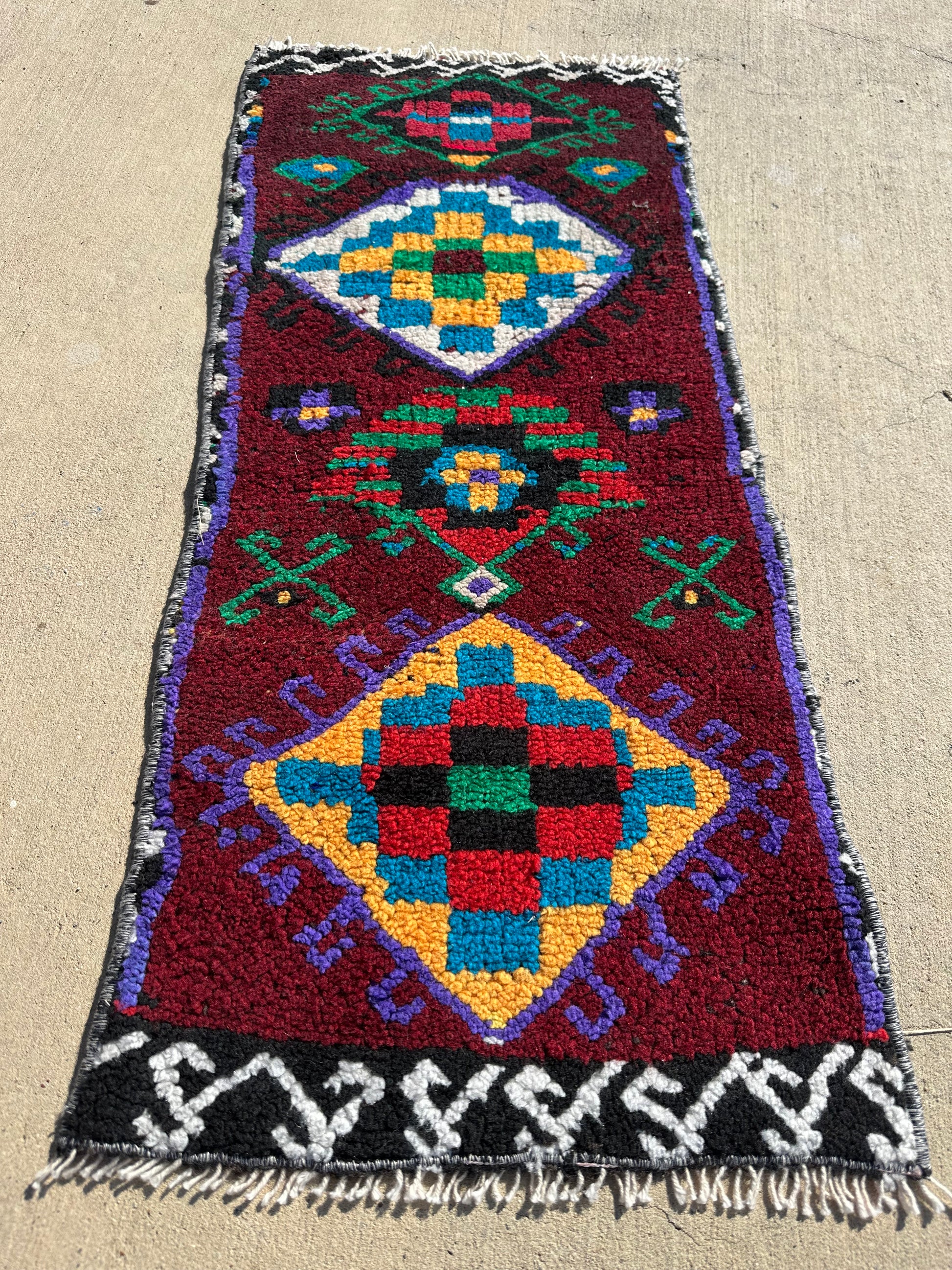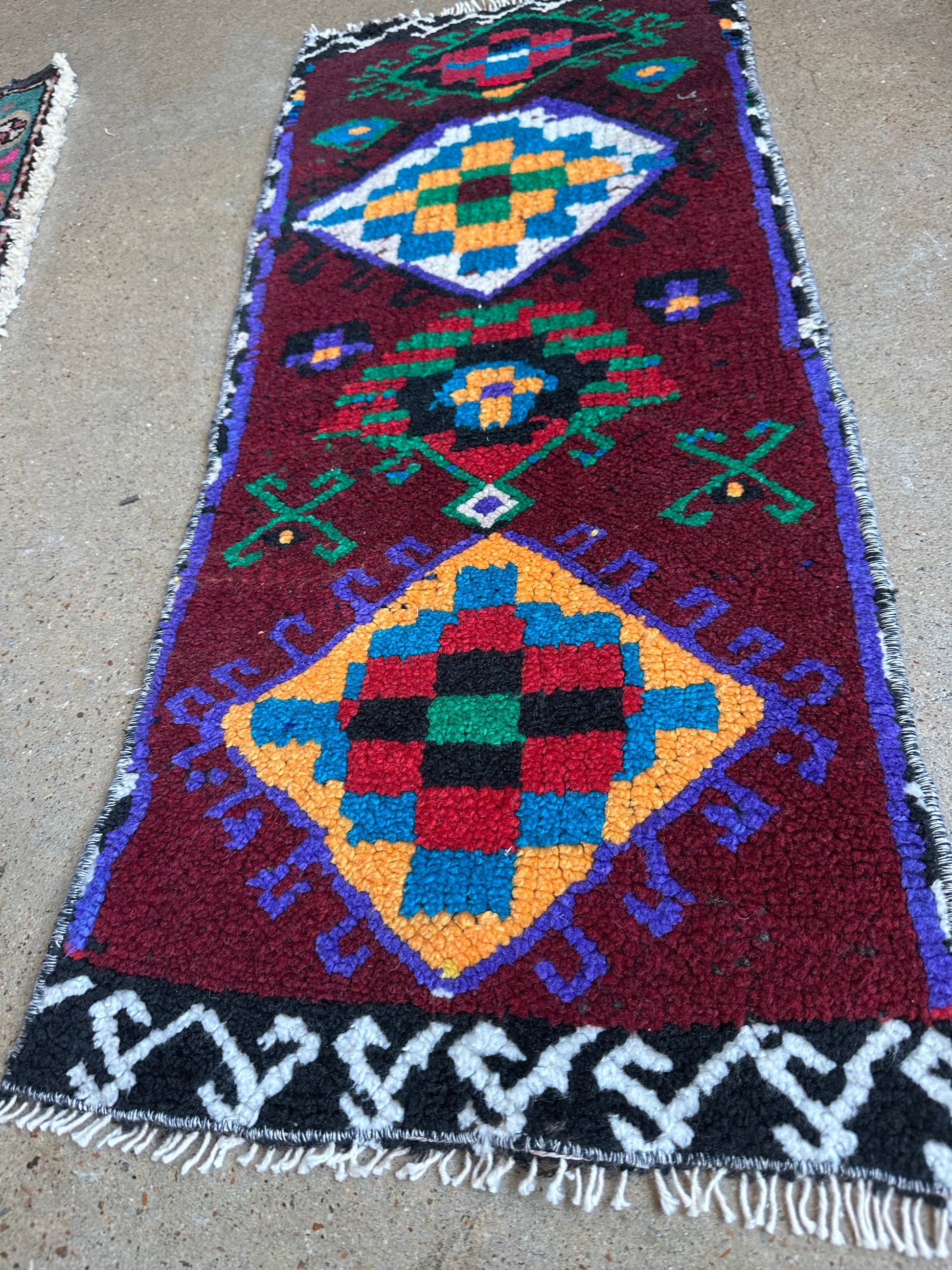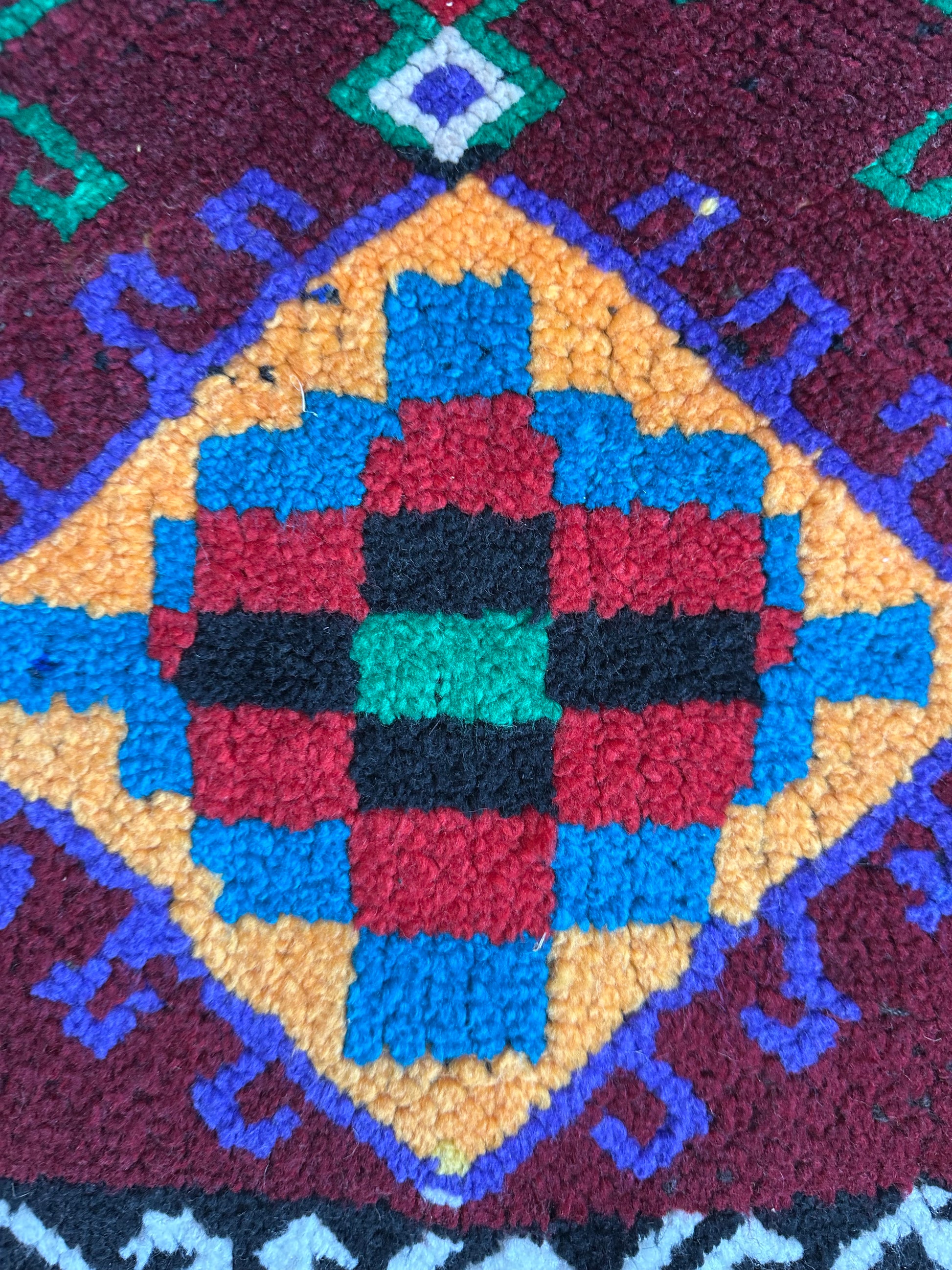 Estimated Origin: 1990s Turkey Handmade (not 100% wool, but I suspect a poly blend of fibers). This rug has a lot in common with Moroccan style and may be made of recycled fibers, however, price reflects that this is not a natural fiber piece.